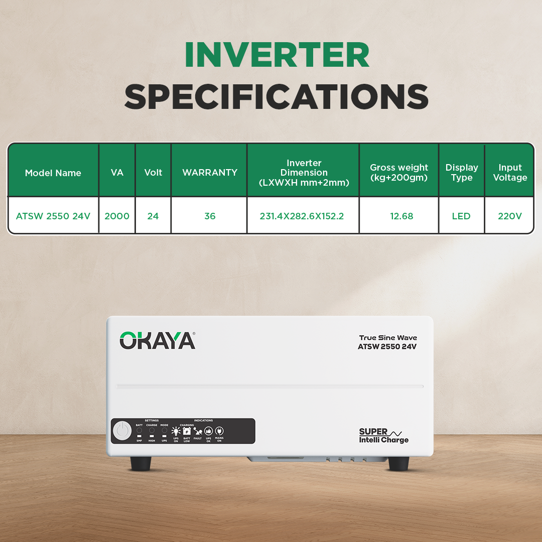 Power your home or workspace with the all-new Okaya ATSW 2550 Home UPS, built to deliver clean and consistent backup power with superior efficiency.Backed by Advanced True Sine Wave Technology and Super Intelli Charge, this 24V inverter offers 15% faster charging, ultra-fast 10ms changeover, smart overload protection, and noiseless operation—making it the perfect choice for high-load usage. Compact in design yet powerful in performance, it runs refrigerators, laptops, TVs, washing machines, 0.5-ton ACs, mixers, and even medical equipment with ease.